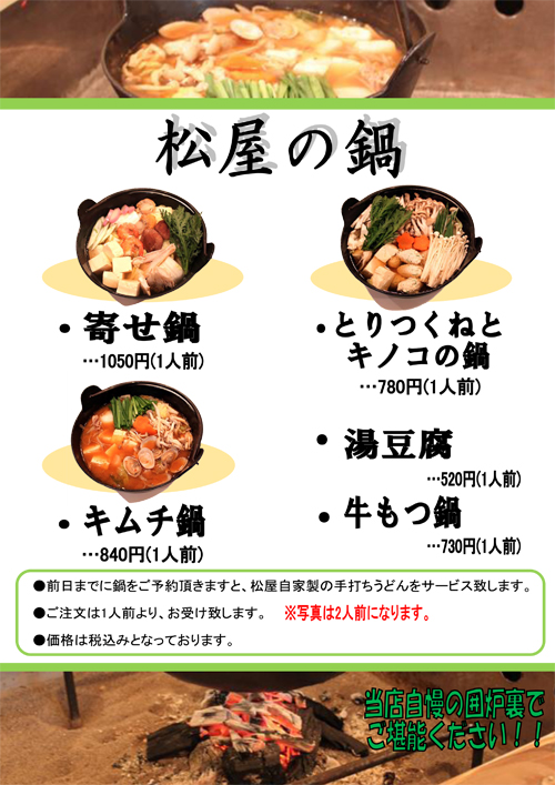 羽生市 居酒屋 松屋(しょうや) 「松屋の鍋」始動★忘年会にもオススメ★